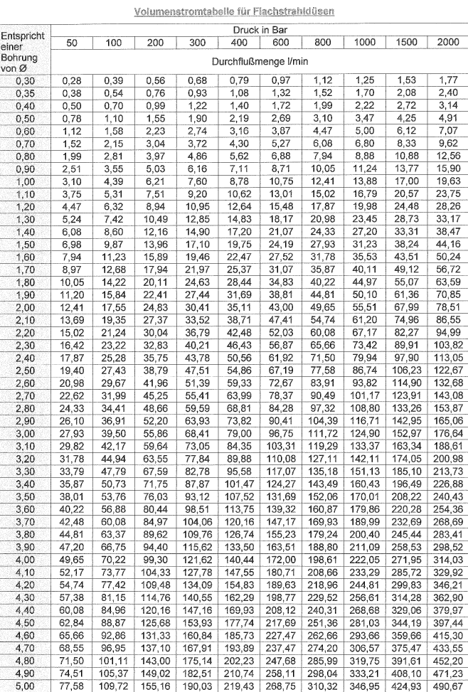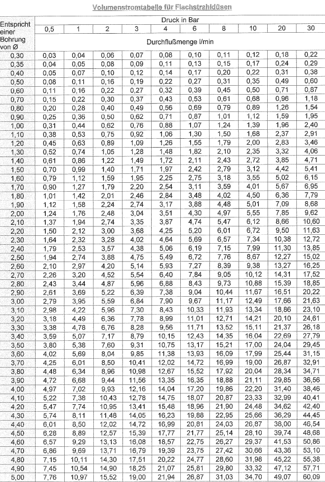 Volumenstromtabelle Flachstrahldüse